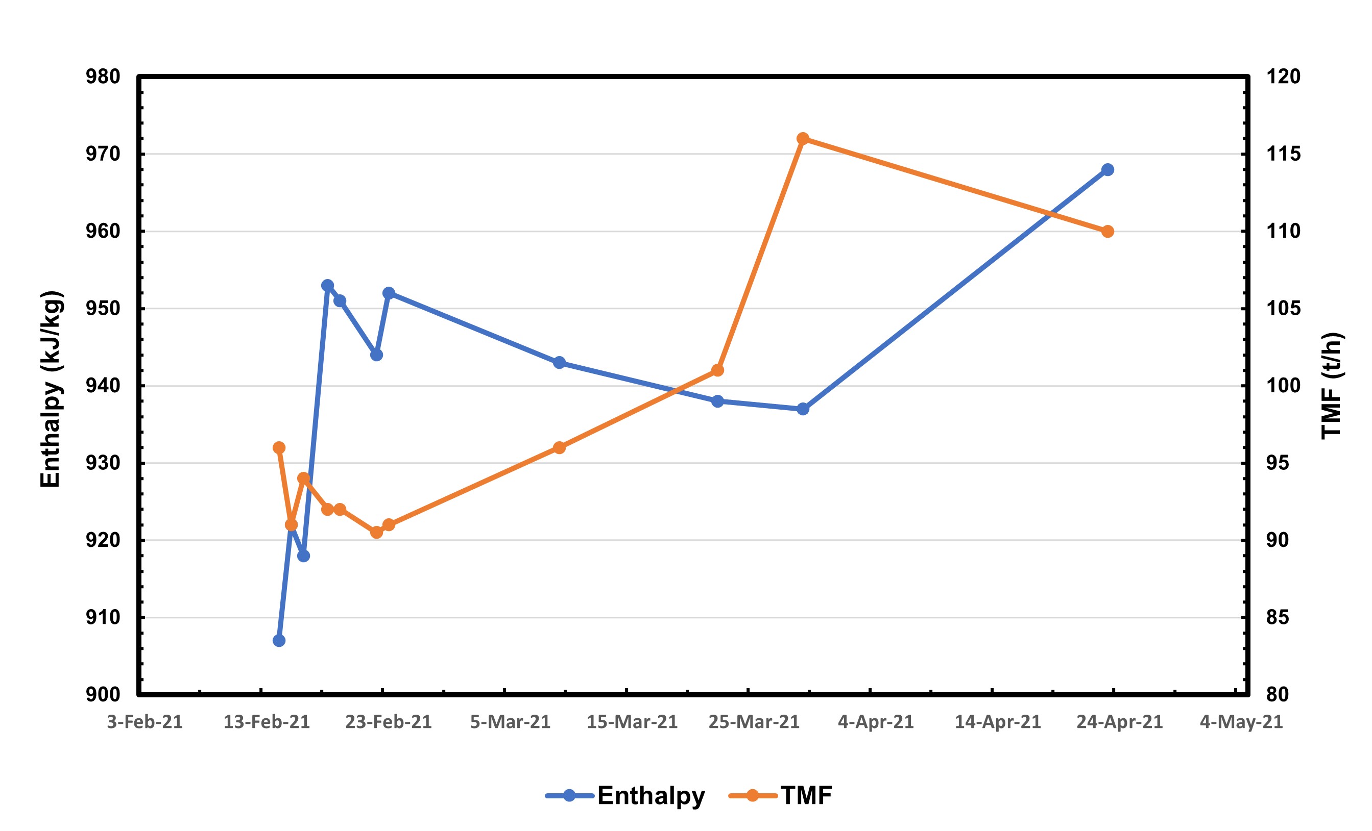 Figure 2 - Enthalpy and total mass flow (TMF) while under Solenis program.
