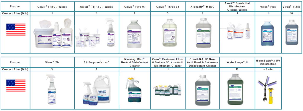 The following are some of the Diversey disinfectants with claims against COVID-19 and are on List N and/or List Q:
