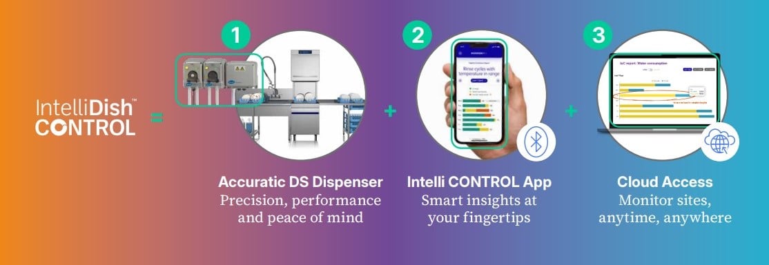 At the core of IntelliDish CONTROL is the Bluetooth enabled Accuratic DS a high-precision, ultra-reliable dosing system that ensures:
